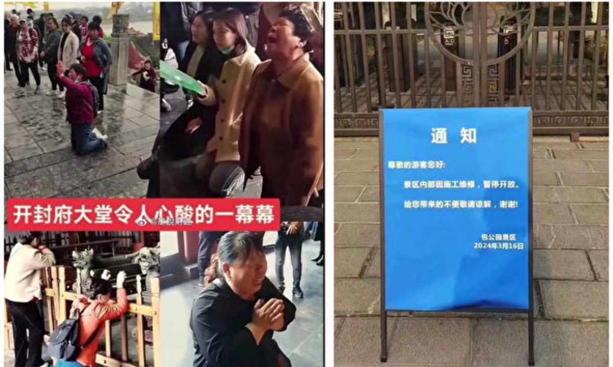 Mới đây, đoạn video ghi lại cảnh một người phụ nữ quỳ gối và khóc tại Đền thờ Bao Công ở Khai Phong, tỉnh Hà Nam, Trung Quốc được lan truyền rộng rãi, gây ra hàng loạt tiếng kêu khóc tập thể trong Đền Bao Công. Khu nhà Đền Bao Công trước tiên dỡ bỏ tượng Bao Công, sau đó thông báo tạm thời đóng cửa để tu bổ. Người dân nói đùa rằng: “Bao Công đã bị coi là nhân tố không ổn định và bị kiểm soát”.