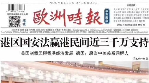Truyền thông của Đảng Cộng sản Trung Quốc ở nước ngoài mấy ngày qua đã gây ra một trò cười trên quốc tế. Tờ Thời báo Châu Âu với cờ hiệu truyền thông nước ngoài đã đăng trên trang nhất bài viết nói 30 triệu người dân Hồng Kông ủng hộ Luật An ninh Quốc gia phiên bản Hồng Kông.