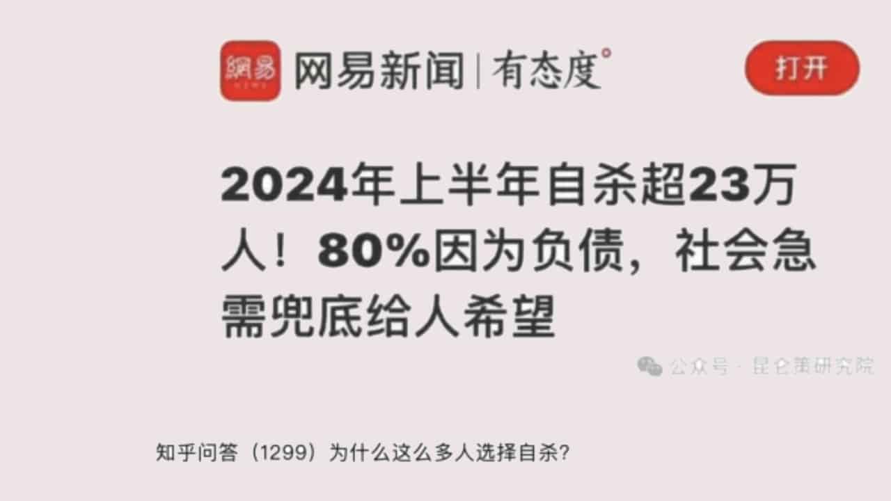 Theo các tin từ truyền thông chính thức tại Trung Quốc, số người tự tử ở nước này trong nửa đầu năm 2024 là trên 230.000 người, trong đó 80% là do nợ nần.
