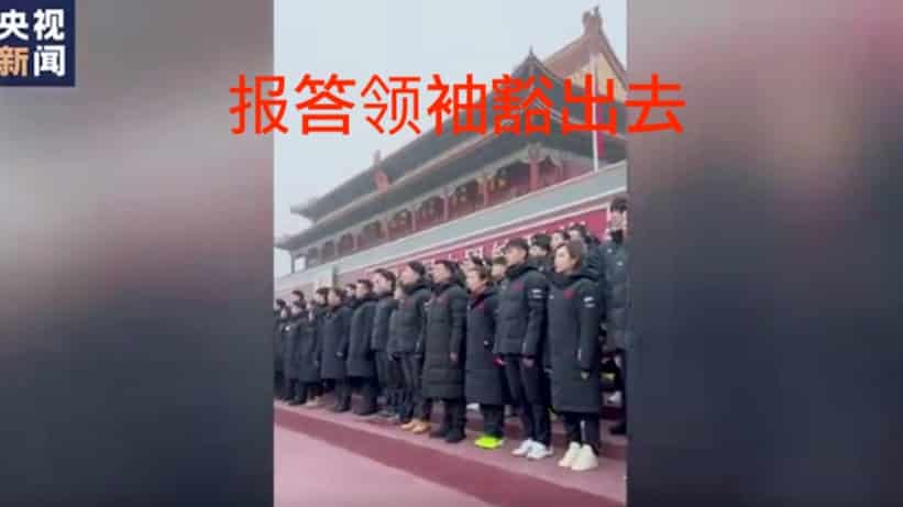 Ngày 27/1, trang web JBpress của Nhật Bản đưa tin, vào khoảng 7:26 ngày 25/1, hơn 100 vận động viên và huấn luyện viên đại diện cho đoàn thể thao Trung Quốc tại Thế vận hội Mùa đông Bắc Kinh, đã tập trung tại Quảng trường Thiên An Môn, giương cao lá cờ 5 sao và hô các khẩu hiệu: “Xông lên vì tổ quốc, không cô phụ nhân dân, trả ơn lãnh đạo bằng mọi giá, mãi đấu tranh cho vị trí số 1, đi theo tổng bí thư cùng hướng đến đến tương lai!”. Nhiệt độ ở Bắc Kinh vào thời điểm đó là -7 độ C.