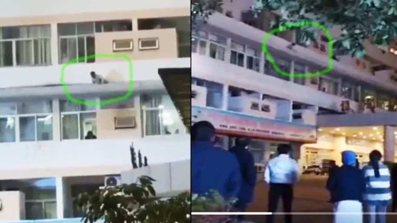 Trong video, tại tòa nhà bệnh viện cao khoảng 8 tầng, một người đàn ông cởi trần đang bò trên ban công tầng 3, vừa lo lắng nhìn ra cửa sổ phía sau, vừa kêu cứu khẩn thiết: “Cứu với, có người đang muốn giết tôi!” Video cho thấy bên dưới có nhiều người hiếu kỳ đang đứng xem.