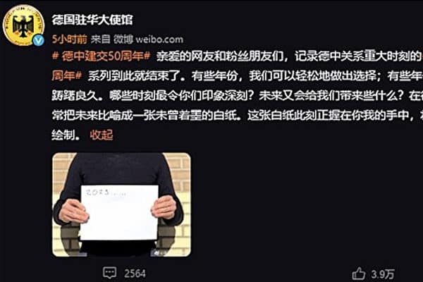 Weibo của Đại sứ quán Đức tại Trung Quốc gần đây đã nhân kỷ niệm “50 năm thiết lập quan hệ ngoại giao giữa Đức và Trung Quốc”, đưa ra đánh giá triển vọng của một loạt các sự kiện. Ngày 1/12, Đại sứ quán đã ra thông điệp có nội dung: “Có những năm chúng ta có thể dễ dàng đưa ra lựa chọn; có những năm chúng ta phải do dự rất lâu. Khoảnh khắc nào khiến bạn ấn tượng nhất? Tương lai sẽ mang lại cho chúng ta điều gì?”