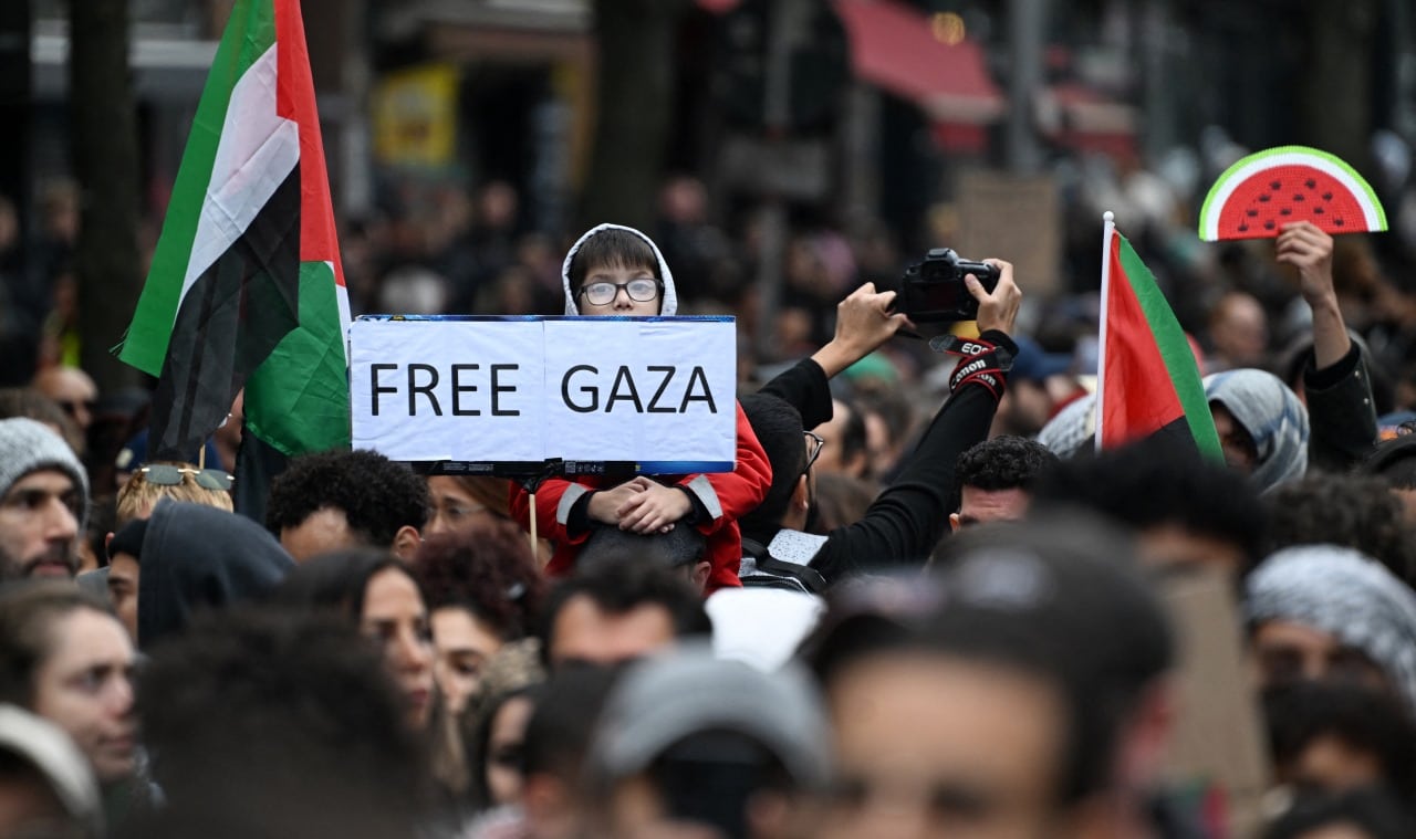 Một cậu bé giữa những người biểu tình bên cạnh tấm biển có dòng chữ "Trả tự do cho Gaza" tại Berlin, Đức vào ngày 6 tháng 10 năm 2024, trong cuộc biểu tình phản đối nạn diệt chủng ở Gaza. (Ảnh: Ralf Hirschberger, AFP, Getty Images)