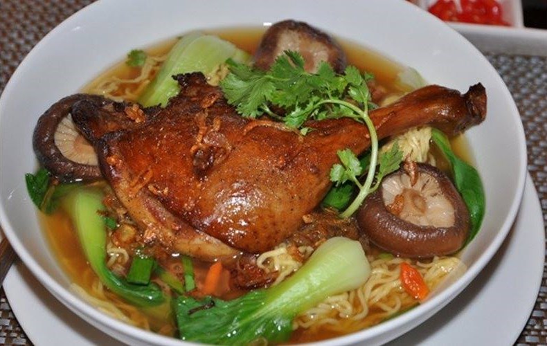 Nổi tiếng không kém nhưng đắt hơn nhiều là mì vịt tiềm. Đây là món dành cho người rủng rỉnh tiền túi vì một tô mì vịt tiềm rẻ nhất cũng phải 70-80 nghìn, còn thì một số tiệm nổi tiếng, giá một tô mì có thể lên đến hàng trăm nghìn. Đắt cũng phải vì thường thường đi kèm với tô mì là một đùi vịt tiềm to tướng hoặc 1 góc tư con vịt. Ngoài các gia vị thường dùng như đại hồi, quế chi, thảo quả, nước dùng của mì vịt tiềm còn có thêm cam thảo và nấm đông cô và thịt vịt được hầm khá lâu. Tùy theo khẩu vị của mình, thực khách có thể chọn thịt vịt được tiềm mềm hoặc thịt vịt tiềm đủ chín sau đó vớt ra chiên ngập dầu cho lớp da bên ngoài vừa vàng vừa giòn. Mì vịt tiềm thường được ăn kèm với cải ngọt và đặc biệt là đu đủ non ngâm chua.
