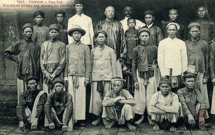 Đề Thám cùng các thủ hạ của mình tại đồn điền Phồn Xương trong thời gian hoà hoãn với Pháp. Đứng sau Đề Thám là một sĩ quan Pháp. (Ảnh: Trung uý Romain Desfosssés, Public Domain)