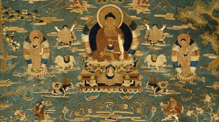 Tranh thêu lụa Đức Phật Thích Ca Mâu Ni và 18 vị La Hán. Tây Tạng, thế kỷ 19. (Tranh: Los Angeles County Museum of Art, Public Domain)