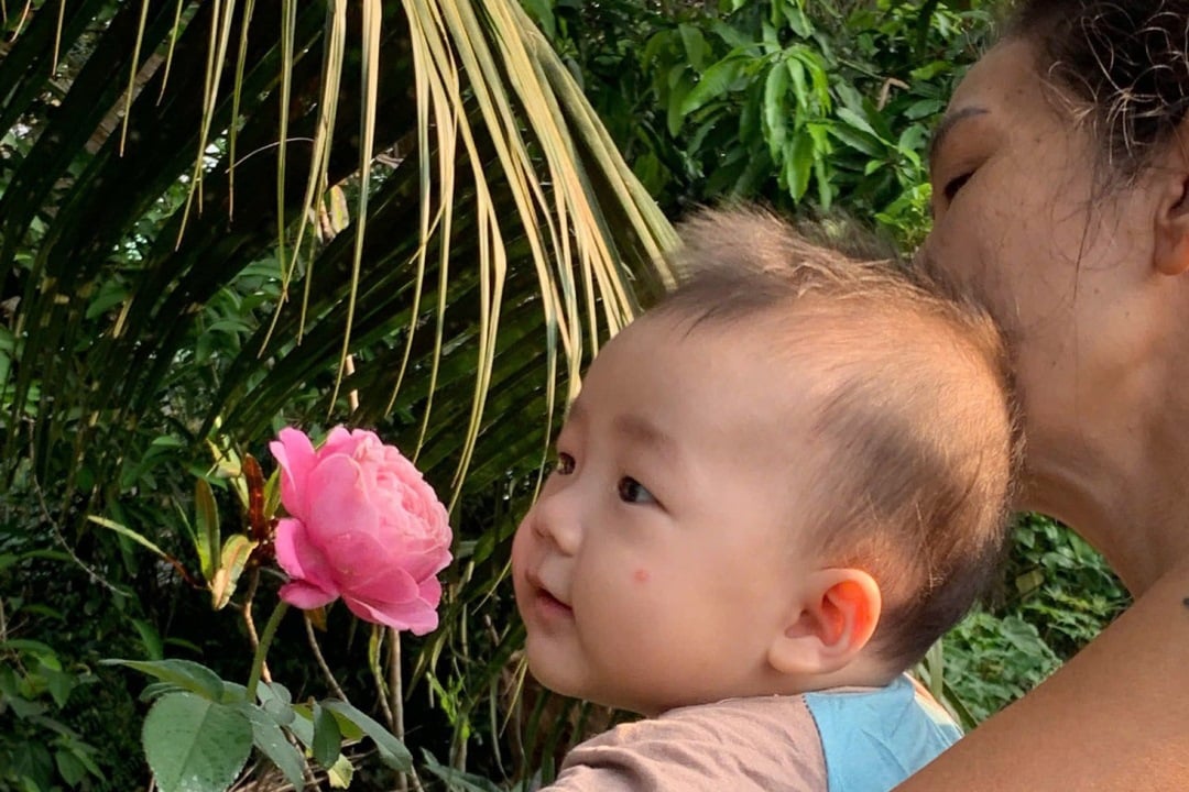 Sáng sáng, khi đưa mẹ ra sân phơi nắng, mình hay bồng thằng cháu ra phơi cùng. Trồng chục gốc hồng, mỗi ngày chăm một chút, để ngày nào cũng có bông cho mẹ ngắm và cắt một hai bông vô cắm bình để bàn đầu giường mẹ. Thằng nhỏ mới mấy tháng, vài lần mình dạy, thế là thấy bông nó liền ghé mặt chu mũi ngửi, rồi quay qua nhìn mình, mắt sung sướng, cười khanh khách.