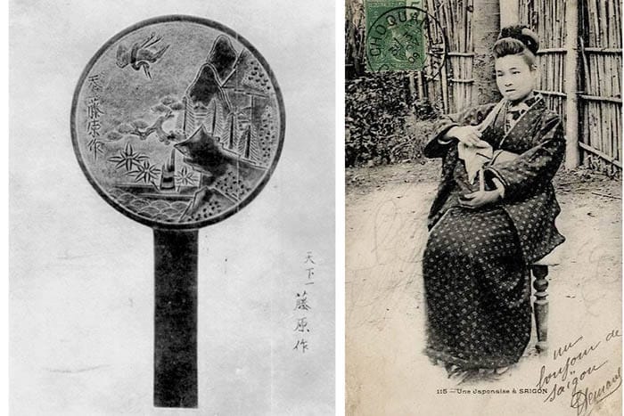 Nhiều cuộc khai quật dưới thời Pháp thuộc còn cho thấy một số hiện vật do người Nhật sở hữu vào thời ấy như đồ gốm, lọ sứ, vại, chai hoặc ly uống rượu saké; nhưng độc đáo nhất có lẽ là những chiếc gương đồng tiêu biểu cho nếp sống văn hóa và sự tinh tế trong nghề thủ công của các nghệ nhân Nhật. Theo sử liệu của người Nhật, chiếc gương đồng đầu tiên là tác phẩm của hai vị thần Ishi-Koro Mikoto và Ama Tsu-ma-ra trong nỗ lực khiến cho nữ thần mặt trời Amaterasu phải ra khỏi hang động của bà. Chiếc gương đồng ấy có tên Yata-no-Kagami đang được bảo quản tại một ngôi đền ở I-sé. Từ đó, nó trở thành một trong ba biểu tượng của vương quyền ở Nhật Bản. Trong lịch sử Nhật Bản, vào năm 100, dưới triều đại Kei-Kô (71-130), lần đầu tiên có những gương đồng được mài bóng. Tại Nara, trong kho báu hoàng gia Sho-so no, người ta lưu giữ nhiều gương đồng có lẽ có từ thế kỷ thứ 7. Từ đó, và cho đến ngày nay, người Nhật sử dụng một kỹ thuật khác để làm gương đồng. Mặt sau gương được trang trí bằng những hình chạm khắc tinh xảo theo kỹ thuật khảm men huyền, khảm xà cừ, với kim loại mạ vàng và sơn mài. Người Nhật Bản xưa cũng có những điều mê tín liên quan đến gương đồng, chẳng hạn đặt nó dưới gối hay dưới giường một đứa trẻ đang đau yếu có thể làm cho sức khỏe của nó hồi phục nhanh hơn; người nào soi gương vào lúc 2 giờ sáng thì sẽ biết được hậu vận của mình; gương đồng được chôn theo người chủ của nó khi an táng…