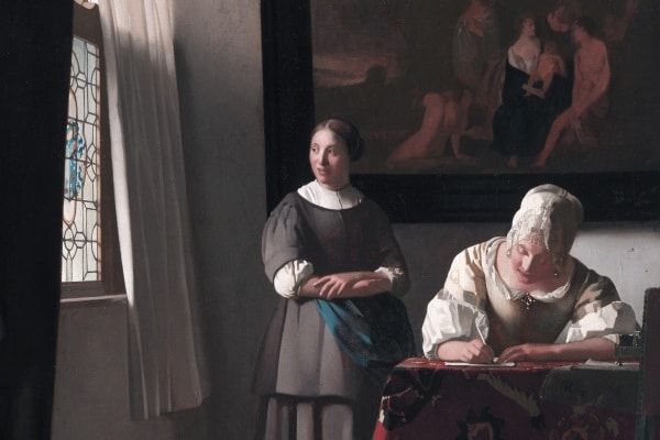 Còn tư thế của cô chủ và cách đổ bóng khiến cho người ta có một cảm giác vận động, với một phong cách hoàn toàn khác người hầu gái. Ở đây, Vermeer đã cho người xem thấy hai thái cực của thời gian: người hầu gái cứ đứng mãi ở đó khiến thời gian như ngừng trôi, còn cô chủ thì cứ viết mãi ở đó khiến người ta cảm thấy thời gian như dài ra vô tận.