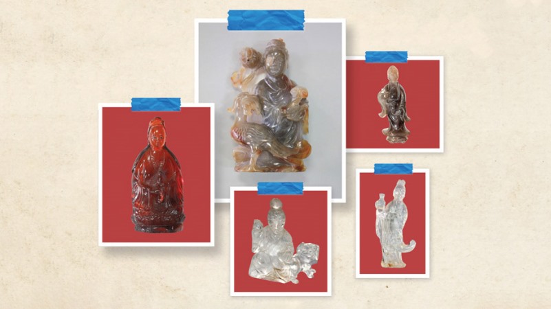 Phần lớn các tượng Phật Quán Thế Âm Bồ Tát đều được thể hiện trong tư thế đứng, tóc búi cao, trang phục áo choàng mềm mại, dài phủ gần tới gót chân, tà và tay áo bay theo chiều gió. Tay tượng cầm bình nước cam lộ để vẩy xuống trần thế cứu vớt chúng sinh. Đặc biệt có một tượng được chế tác từ thạch ngọc màu nâu xám. Tượng có khuôn mặt bầu tròn, miệng ngậm, sống mũi cao, mắt nhỏ và dài, dái tai to và dài, tóc nhiều và búi cao. Hai tay cầm nấm linh chi đặt trước bụng, bên phải Phật có một con chim trĩ lớn ngậm cành hoa Phù dung. Riêng tượng Phật Quán Thế Âm duy nhất bằng hổ phách, được thể hiện ở tư thế an tọa trên tòa sen, một tay cầm bình nước cam lộ và một tay lần tràng hạt.