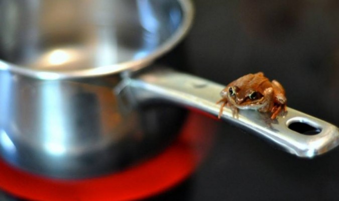 Con ếch ngồi trên cán nồi trên bếp nóng (James Lee/CC BY 2.0)