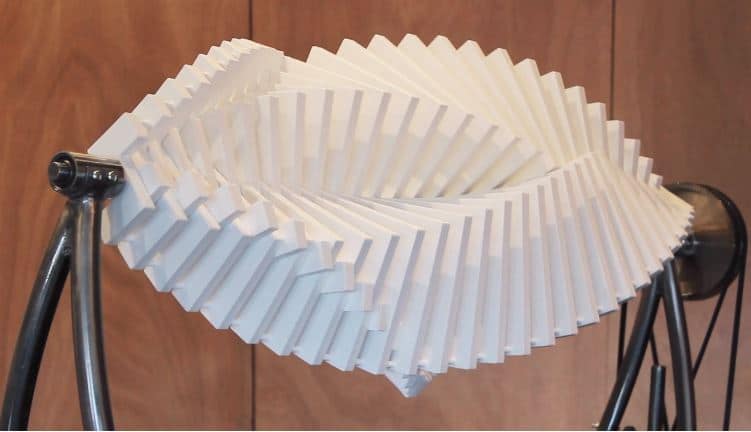 Các góc và đường cong khác nhau của các bộ phận riêng biệt tạo ra sự thống nhất tổng thể một cách hoàn hảo khi kết hợp chúng trên trục. Hai ‘cánh’ được hình thành bởi 77 bộ phận này có thể trượt qua nhau và xoay theo hướng đối diện với tốc độ sai lệch nhau chút ít. Điều này khiến chuyển động có vẻ phức tạp hơn nhiều, nó có nhiều lớp, làm cho các hình dạng lặp đi lặp lại và như thể đang di chuyển trong nhau.